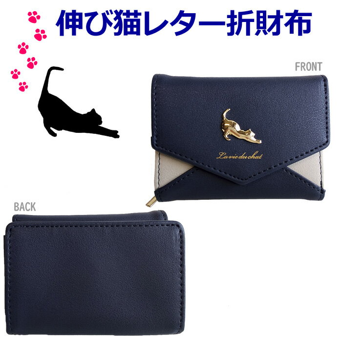 [伸び猫レター折財布] ネコ好きさんにおススメ! かわいい伸びネコの立体金具がワンポイント♪